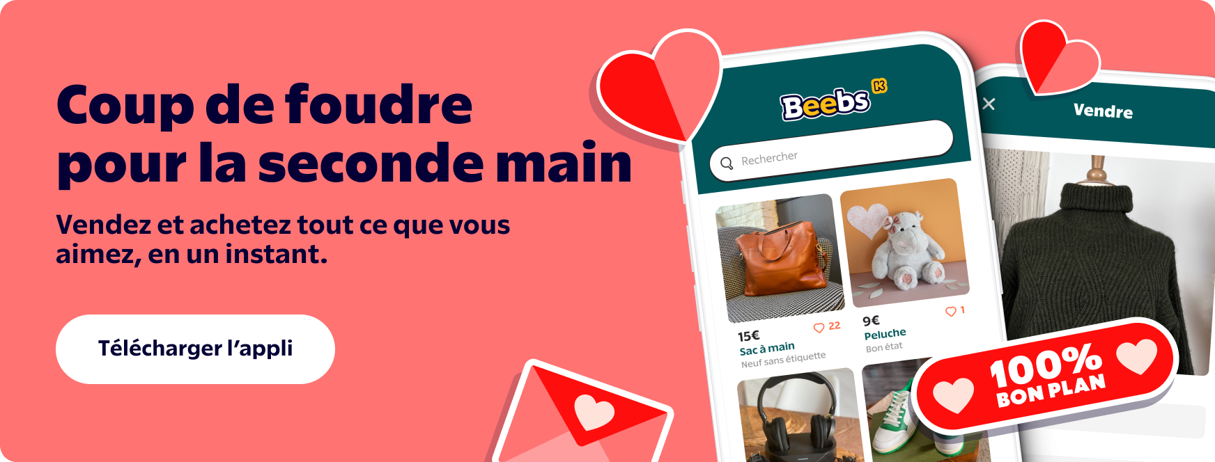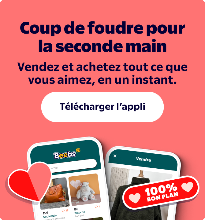 Beebs, c’est l’application de seconde main pour acheter et revendre des affaires pour toute la famille. Mode enfants, adultes, couches, déco, mobilier, jouets, livres, produits de soin… Plus de 6 millions de bonnes affaires d’occasion à des prix jusqu’à 80% moins chers qu’en magasin. Parfois même encore neuves, avec étiquette ! Et pour les achats comme la vente, c’est pas sorcier : tout est simple et sécurisé.