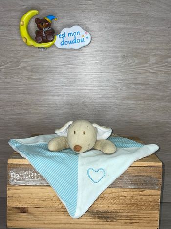 Doudou plat chien bleu foulard vert mots d'enfants poussin pomme gris rayé Herbe