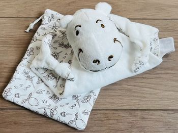 Doudou plat losange hippopotame blanc feuilles fleurs Pranarom