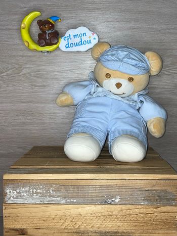 Ours Takinou doudou plat bleu beige carreaux plat triangle ancien Marron Peluche