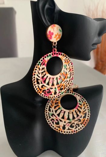Boucles d’oreilles XXL pendantes bohème en bois et tissu floral coloré et blanc