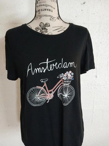 🖤 T-shirt noir motif Amsterdam & vélo fleuri – Primark – Taille 40/42 – Très bon état