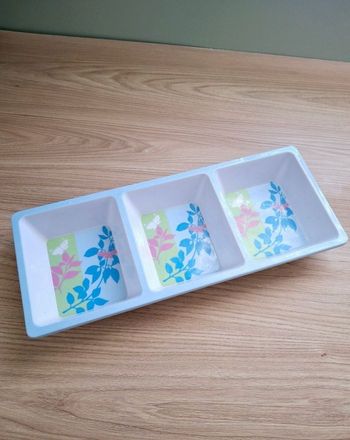 Plat apéritif 3 compartiments bleu/rose/blanc/vert floral/papillon