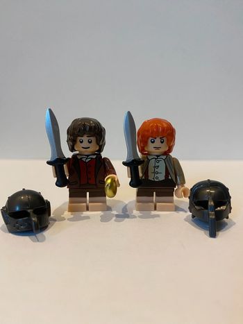 Figurine type lego Frodon et Sam avec les casques d’orcs. le seigneur des anneaux