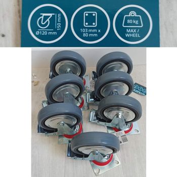 Capacité 80kg par roues / 7 grosses roues pivotantes avec freins