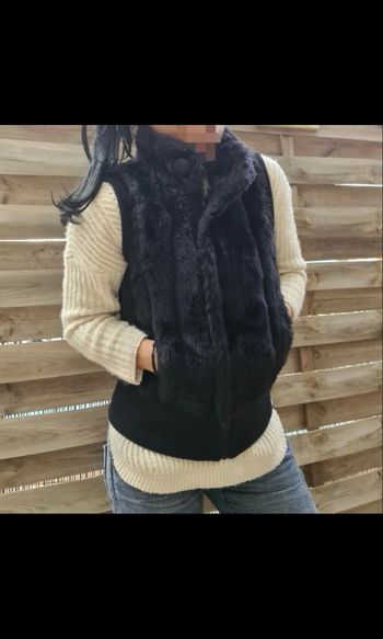 Veste sans manches fausse fourrure noire Deux poches plaquées latérales Col rond montant Fermeture par glissière et deux gros boutons Finitions bords côtes Toute doublée