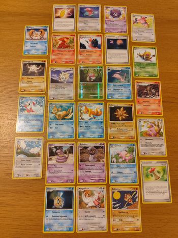 Bonjour Je vends ce lot de 27 cartes Pokémon toutes différentes Série diamant et perle duels au sommet Vintage et anciennes Année 2008 Les cartes sont en bon état général Le lot comprend notamment : Muciole 92/106 reverse Rosabyss 38/106 Muste