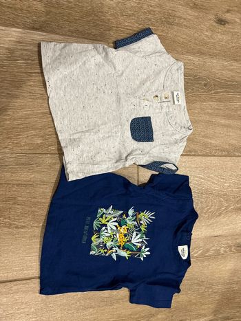 2 t-shirt tape a l’œil bleu petit aventurier et petite poche bouton 9 mois