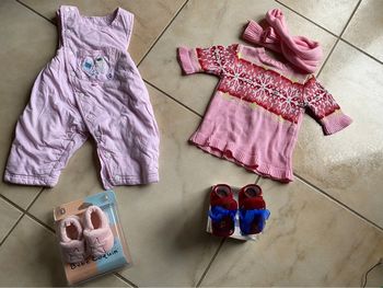 Lot vêtements bébé fille 1 mois pull laine , écharpe et salopette chaude, chaussons
