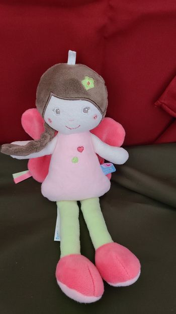 Doudou Poupée papillon velours marron rose et vert Avec ailes velours fuchsia