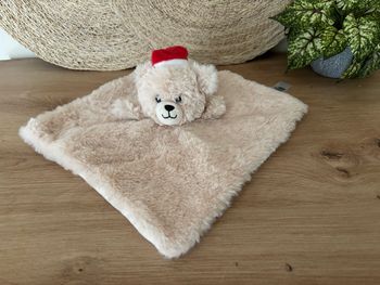 TEX Baby Doudou plat ours fourrure marron beige bonnet de Noël Carrefour comme neuf étiquette coupée