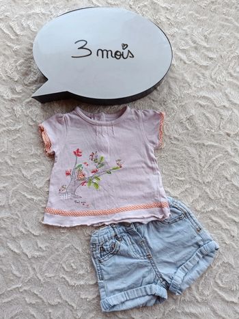 Ensemble (blouse manches courtes+short jeans) Fille 3 mois oiseau 100% coton