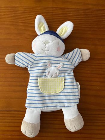 Doudou Lapin marionnette bleu blanc rayé poche Sergent major