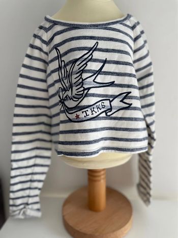 🌺IKKS 6mois Très joli teeshirt manches longues bleu marine et blanc pois rayure blanc moufles fille
