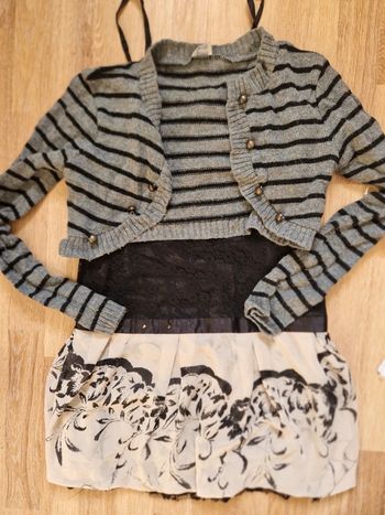 Ensemble composé d'un pull blanc à paillettes et d'une mini jupe noire à paillettes