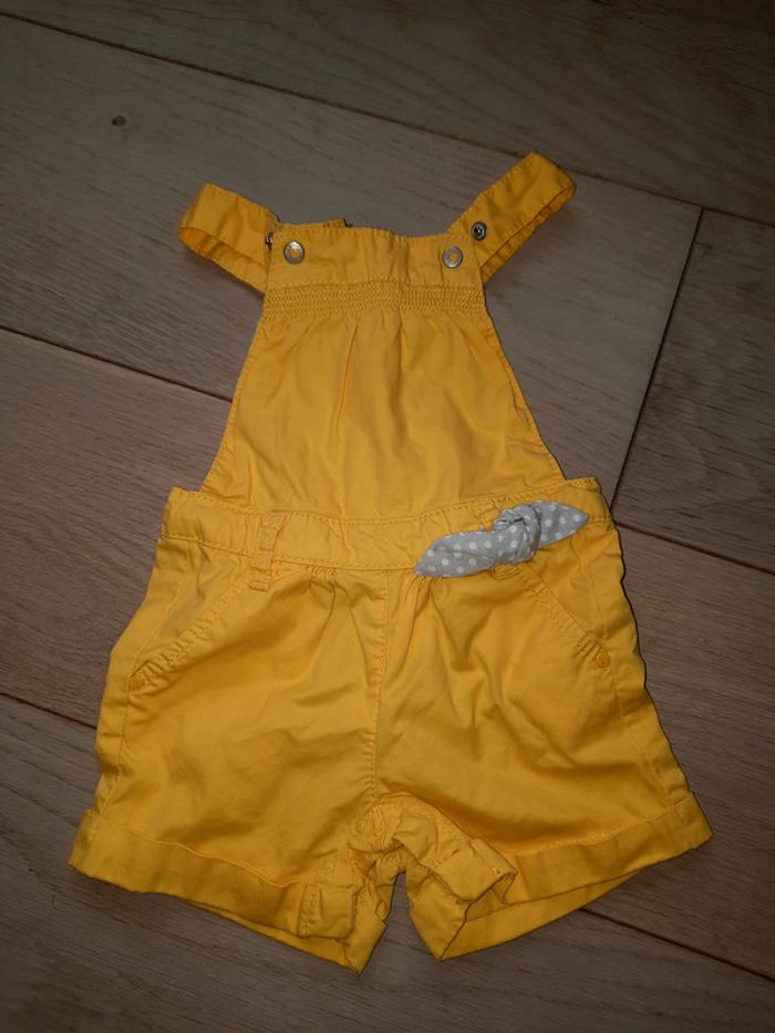 Salopette-short Okaïdi/Obaïbi jaune. Taille 3 mois/59 cm. Matière 100% coton. Ouverture pressionnée à l'entrejambe. Bretelles réglables en hauteur grâce à 2 pressions. #ab8573_3moisfille