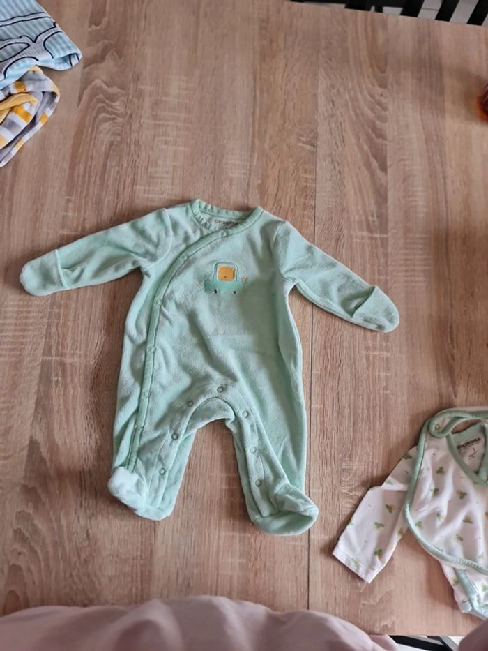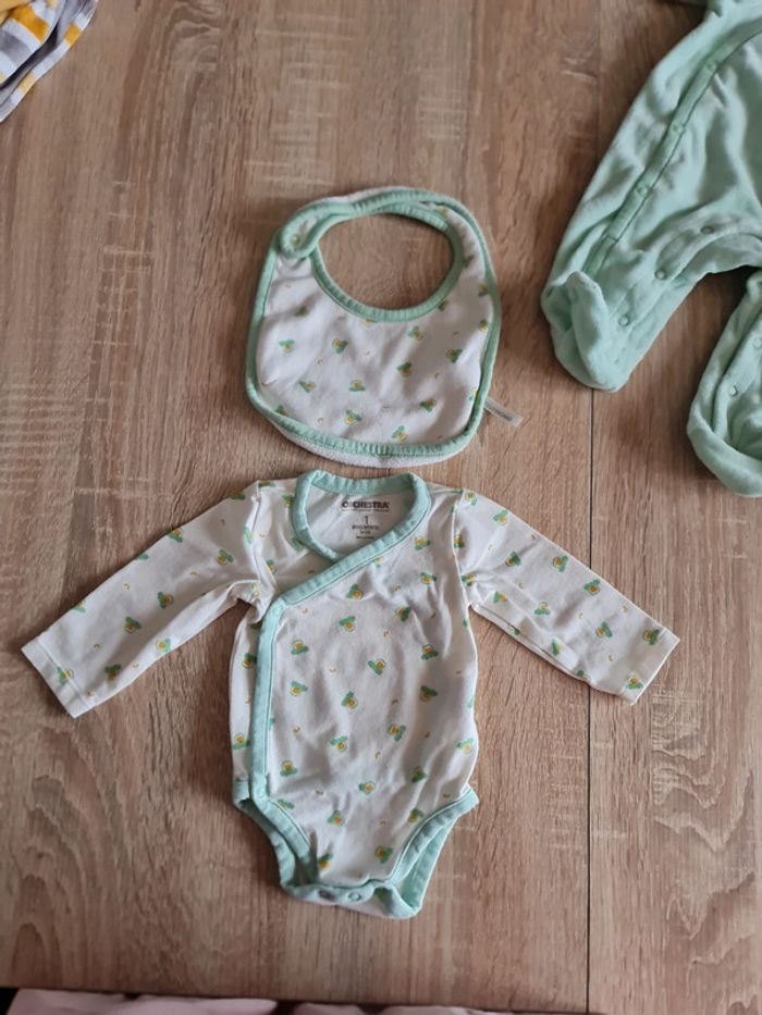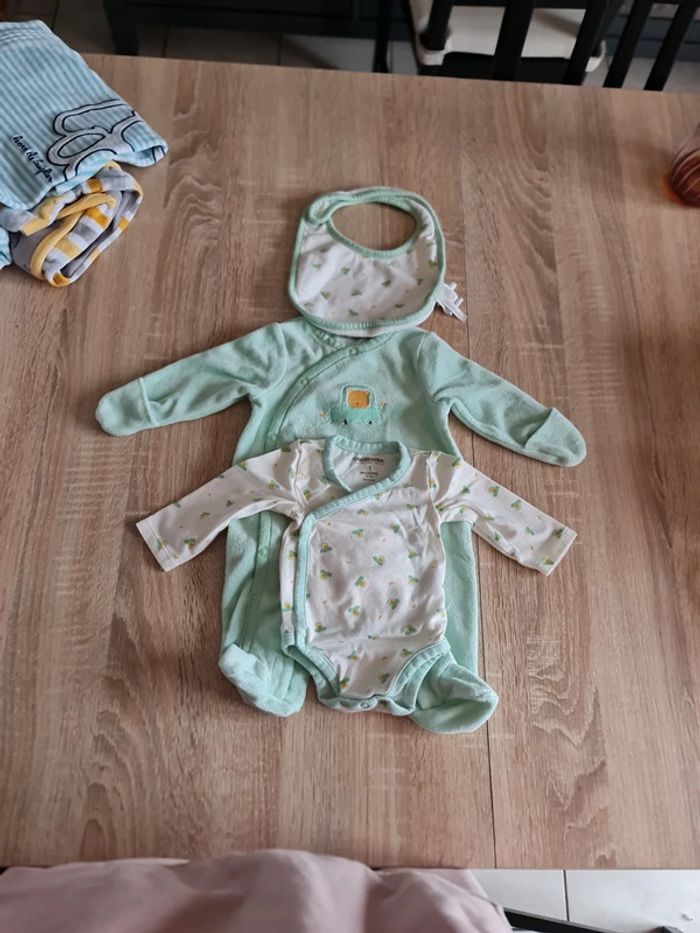 Ensemble body, pyjama et bavoir. Jamais porté car bébé trop grand à la naissance. Comme neuf.