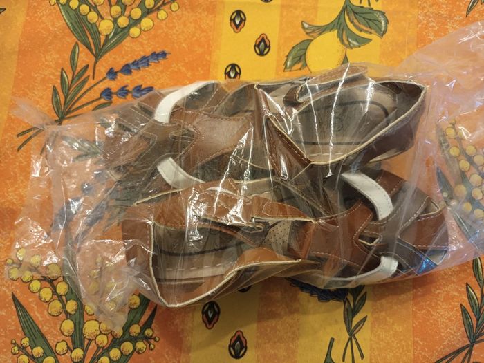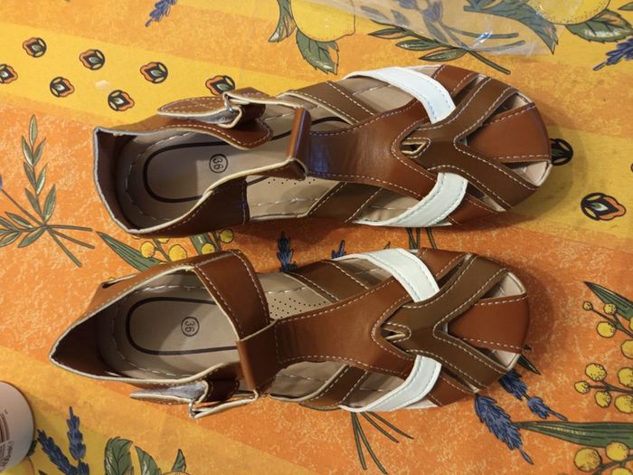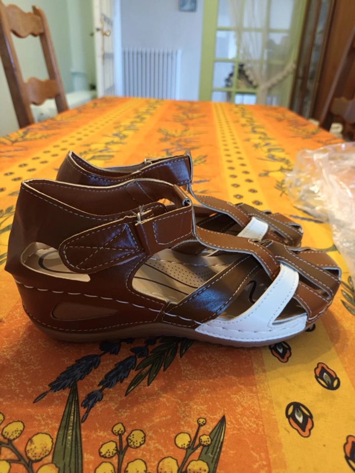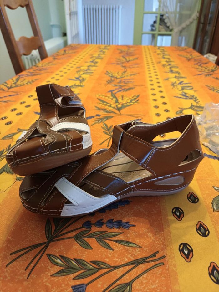 Chaussures ouvertes Femme Pointure 36 Couleur marron et blanc Scratch sur le côté Semelle compensee Neuves jamais portees