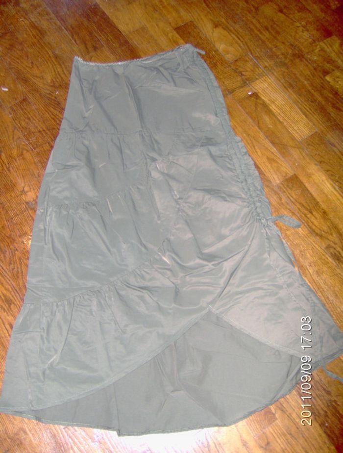 jupe longue femme taille 42-44 (marqué 44 mais petit 44) Couleur vert kaki Plusieur volants et froncee sur un cote 58% polyamide 42% coton Fermeture eclair sur un cote Marque les folies d havvy Etat neuf : porte une seule fois pour un mariage
