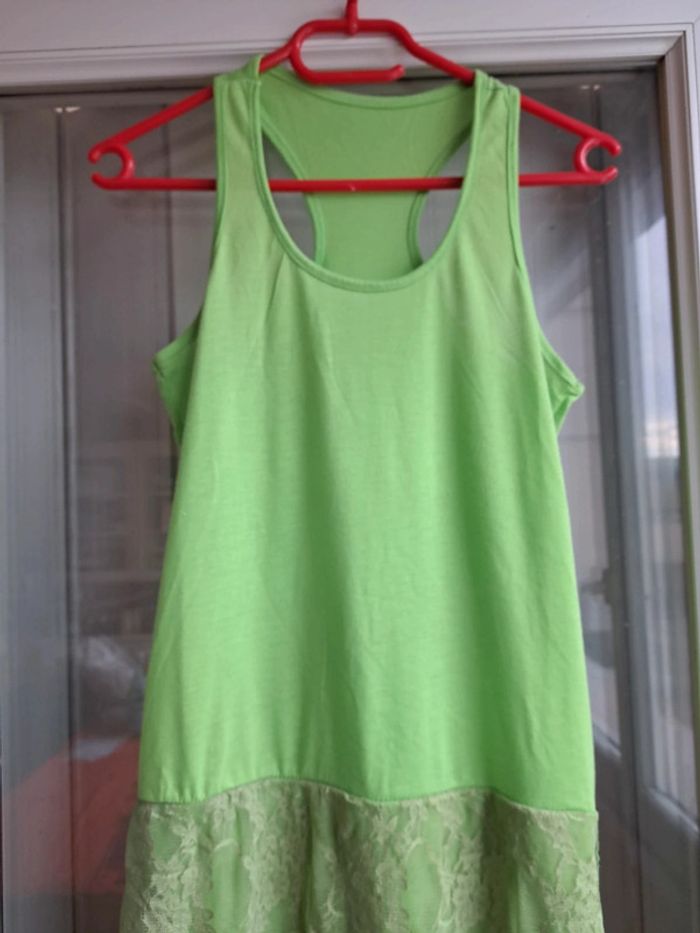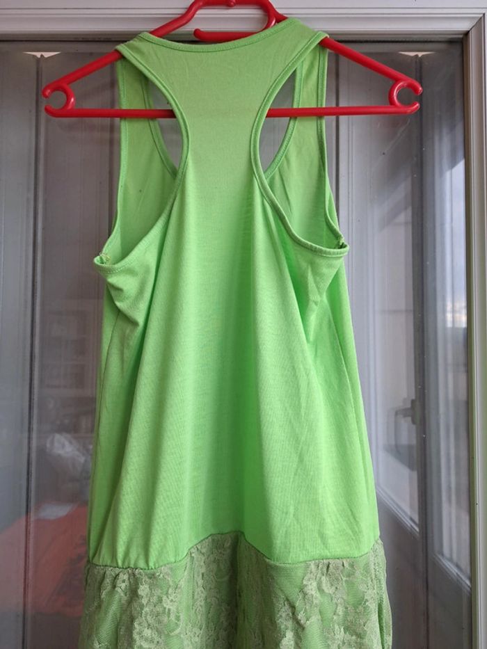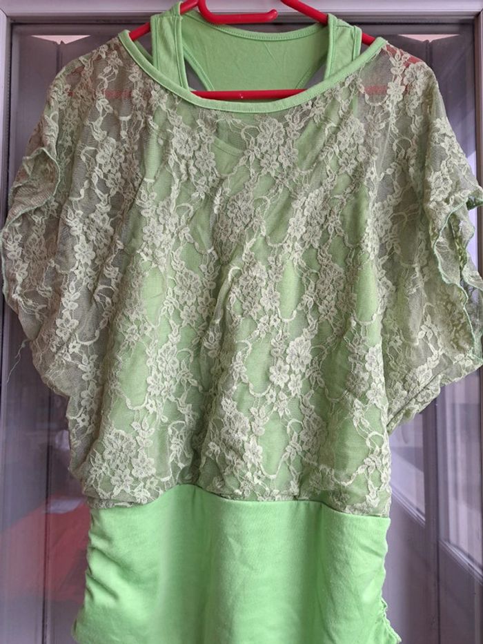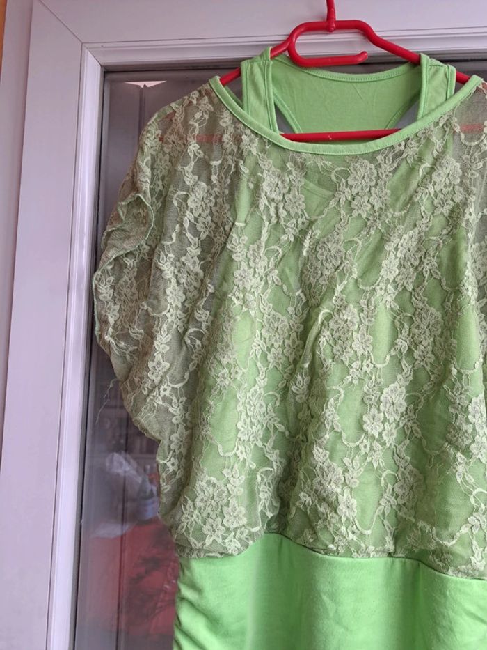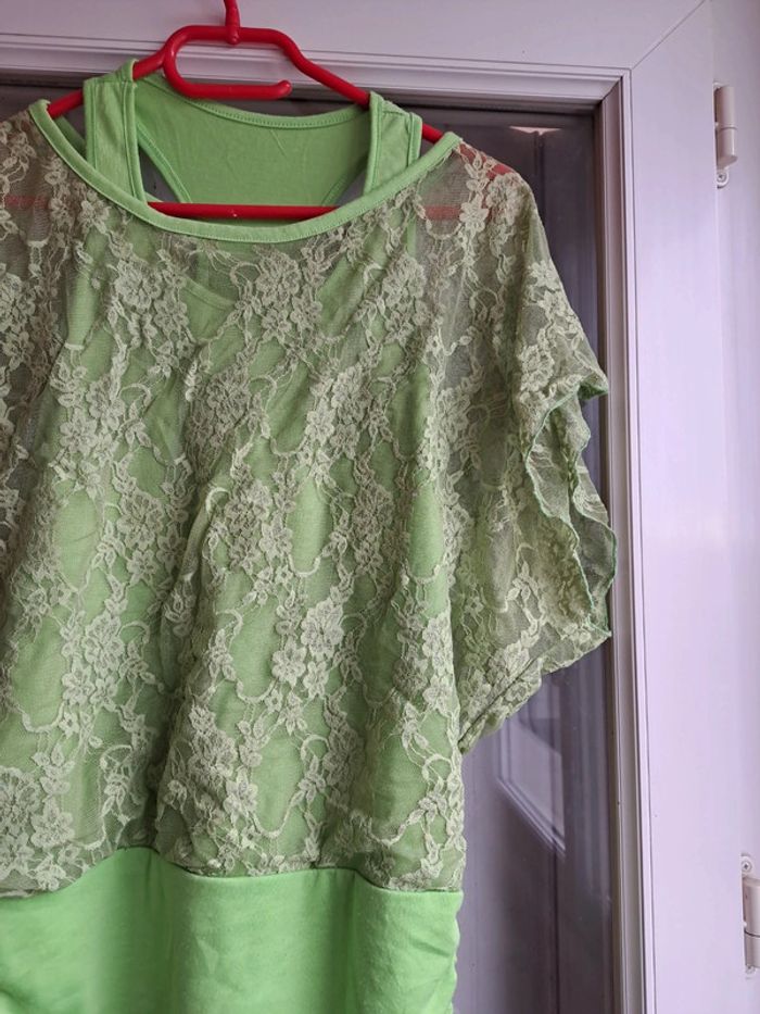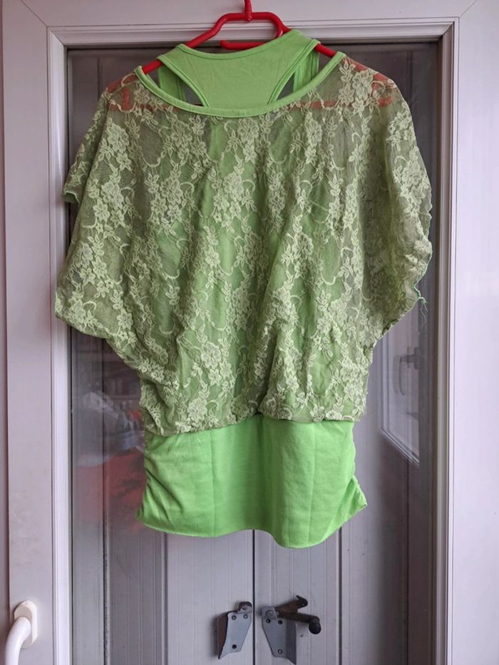 #pitchoune711femmetu Top femme Taille unique Couleur vert Composé de 2 parties totalement inséparables A l'intérieur, un débardeur Sur le dessus, un top sans manches en dentelle Effet manches chauve-souris État impeccable