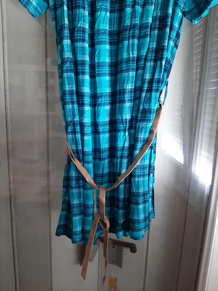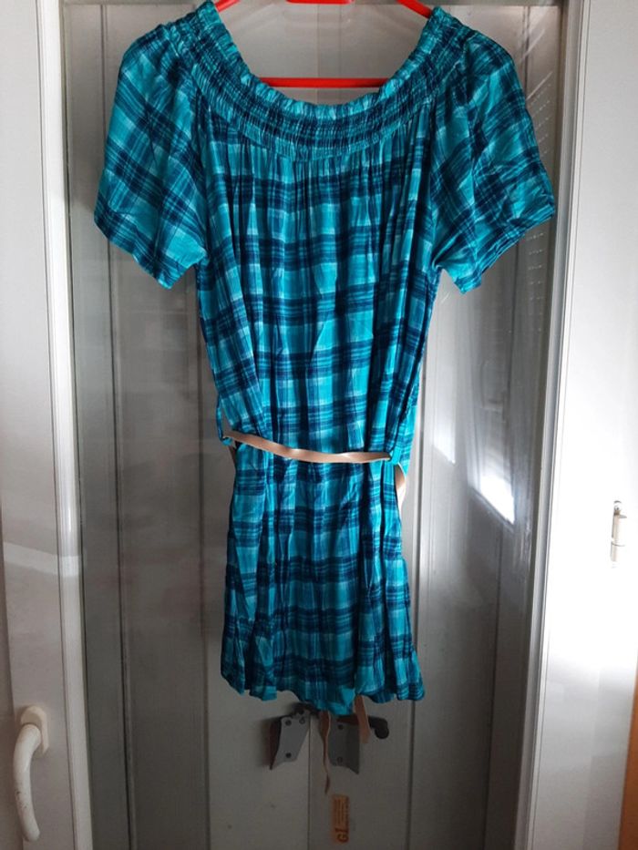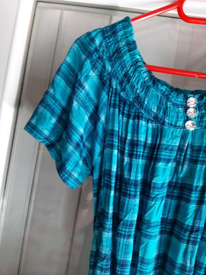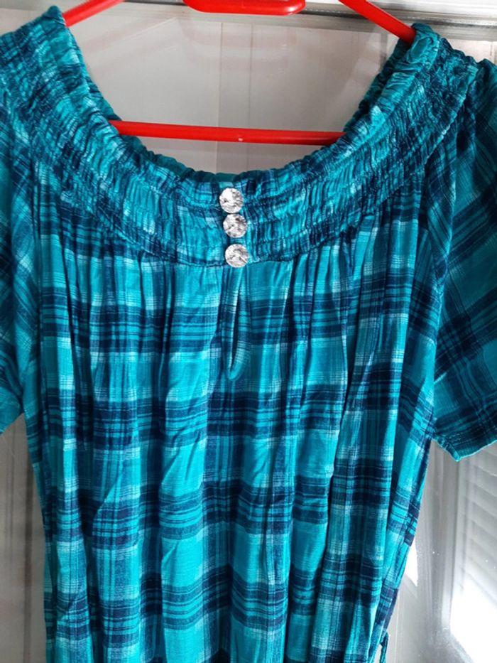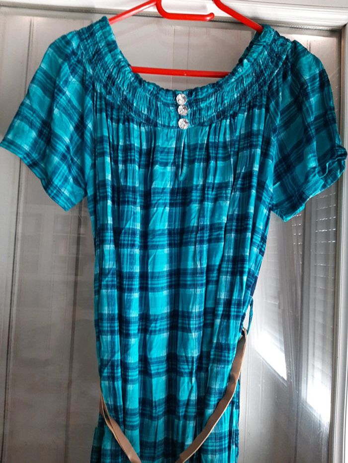 pitchoune711femmetu Tunique femme Taille unique Extensible donc convient à toutes les morphologies Manches courtes Encolure élastique et faux boutons Turquoise à carreaux Ceinture État impeccable