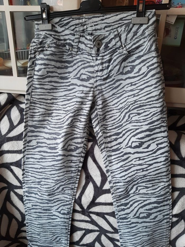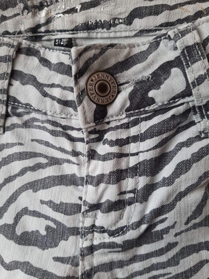 Pantalon femme Taille 36 Marque JENNIFER Skinny Motifs zèbre noir et blanc (le noir est légèrement passé mais c'est très discret) Bouton et fermeture éclair Poches devant et derrière Coulants pour ceinture État impeccable