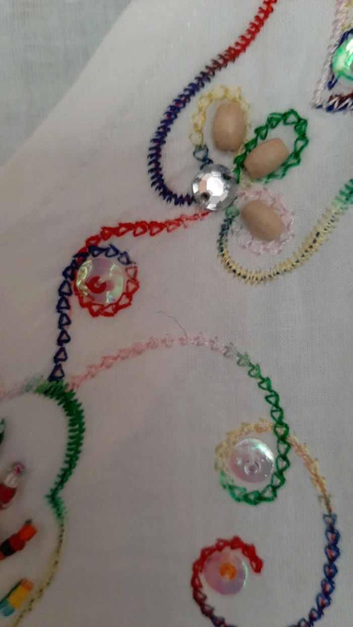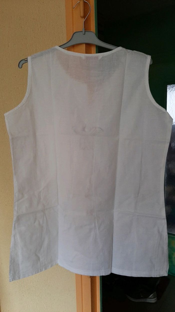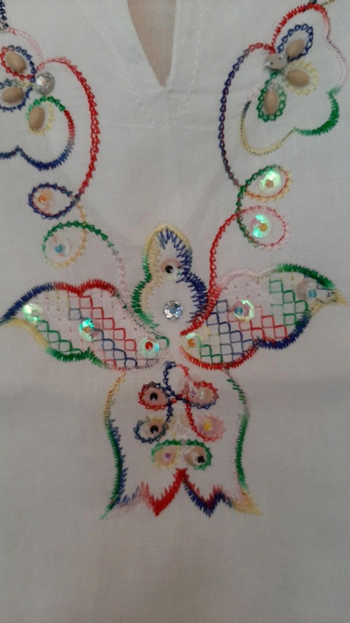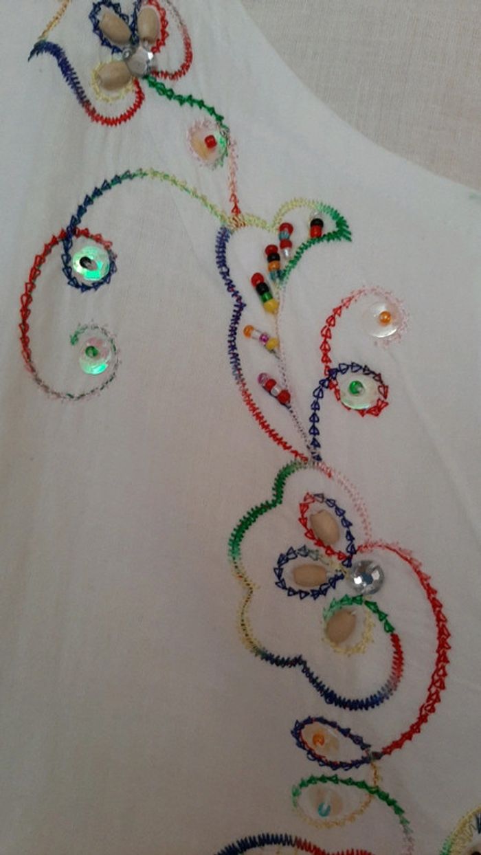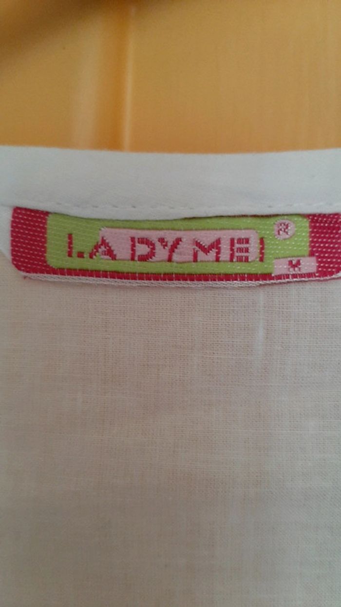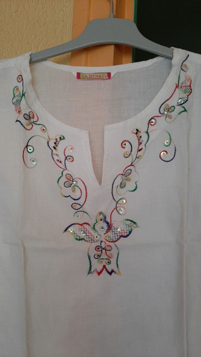 #pitchoune711FEMMEM T-shirt femme Taille M Long Marque LADYME Couleur blanc avec dessins cousus en couleur +strass et perles État impeccable