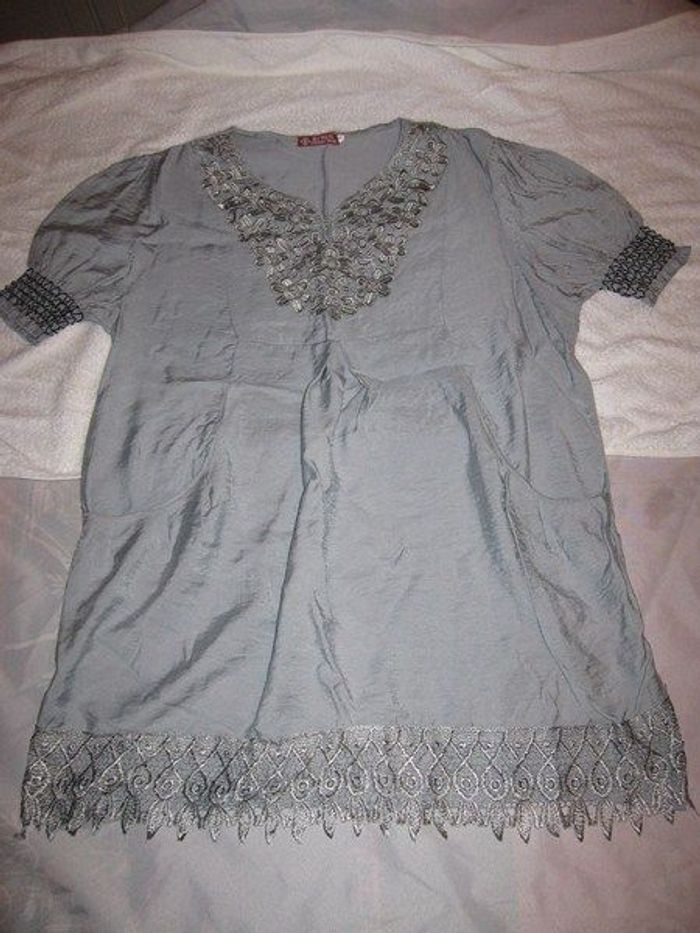 #pitchoune711FEMMEL Tunique femme Manches courtes. Couleur grise Dentelle au niveau du col et en bas Jamais portée.