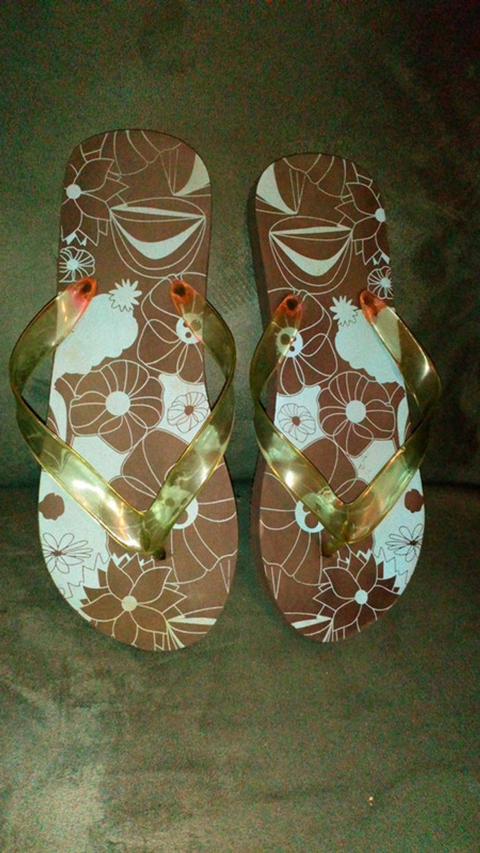 #pitchoune711FEMME38 Tong pointures environ 38. En mousse et plastique. Couleur marron et bleu.