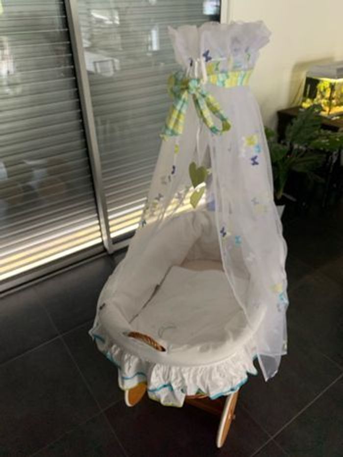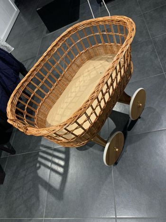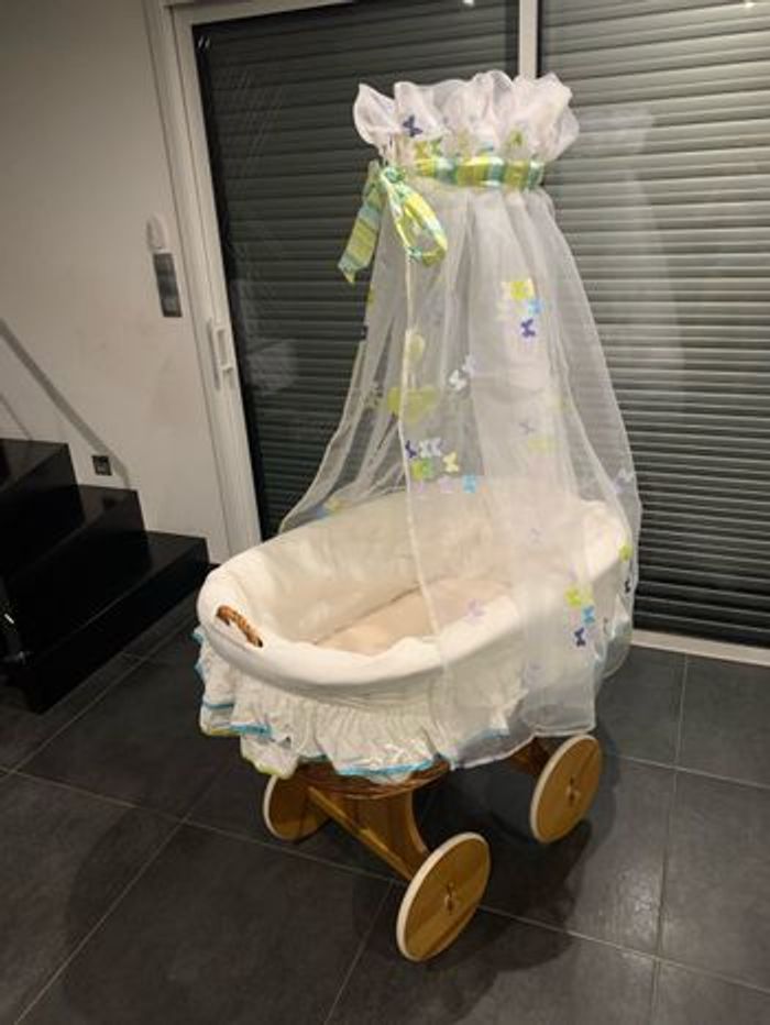 Magnifique Berceau avec voile en osier sur roues de la marque Linie Jeannine. Berceau très agréable et bien entretenu. Grand panier spacieux en osier tressé - socle en bois avec grandes roues en bois caoutchouté - équipe d'un voile en très bon état -maison non fumeur Équipement : Voile, ruban dans le voile avec 2 coeurs, 2 parures de lit assorties, 2 draps-housses, matelas, nid de protection en coton blanc. Dimensions du matelas : L = 75 x l = 44. Dimensions totales : L = 95 x l = 65 x H = 175cm. A récupérer sur place