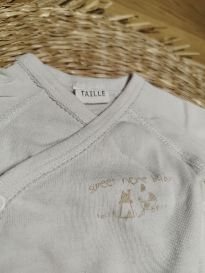 Body sweet home baby de marque inconnue, en bon état (un peu jauni au niveau du col), en taille naissance. N'hésitez pas à faire des lots 🌱