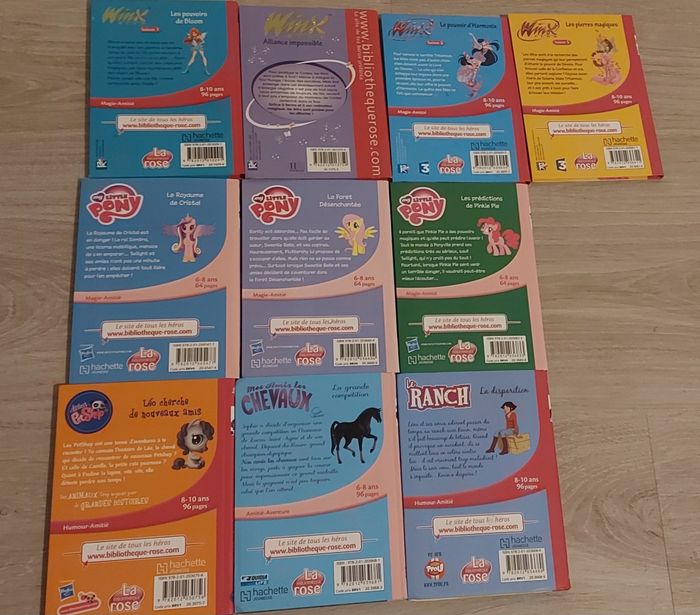 Lots de 10 livres de le marque bibliothèque Rose. Il y a : Les winx My little Pony Littlest PetShop Mes amis les chevaux Le ranch