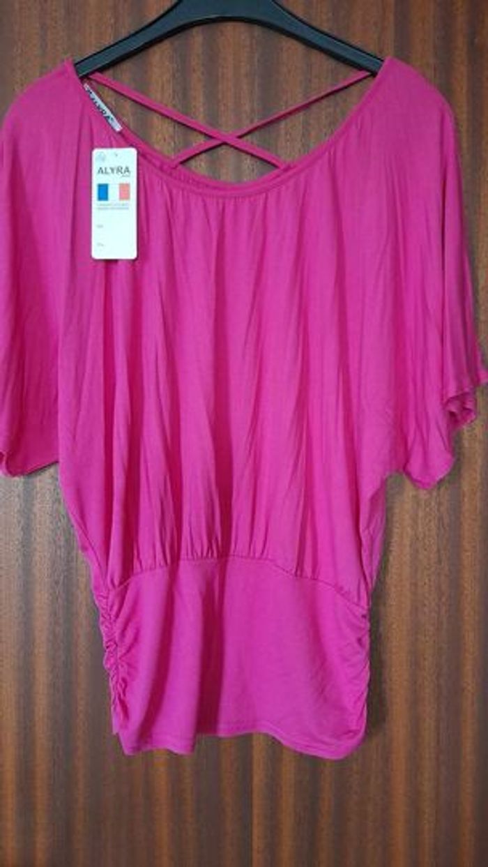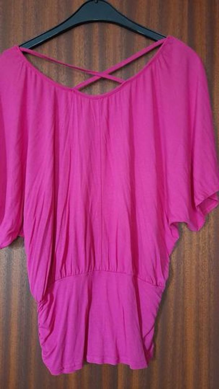 Tunique rose manches courtes froncée dans le bas (sur les côtés) couleur rose taille unique jusque 42