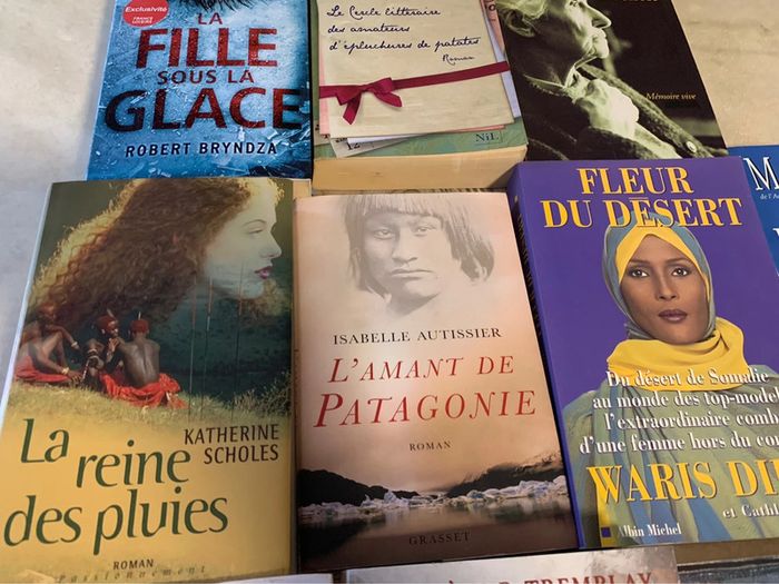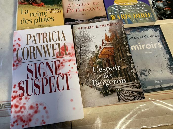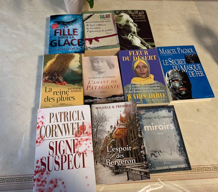 Lot de 10 livres En bon état * L'Espoir des Bergeron, Intégrale Michèle B. Tremblay * Le secret du masque de fer Marcel Pagnol * Miroirs Gérard De Cortanze * Signe suspect Patricia Cornwell * L Amant de Patagonie Isabelle Autissier * Le Cercle littéraire des amateurs d'épluchures de patates d'Annie Barrows et Mary Ann Shaffer * La Reine des pluies Katherine Scholes. * La Fille sous la glace Robert Bryndza * Fleur du désert Waris Dirie * Augustine Rouvière, Cévenole Raymonde Anna Rey