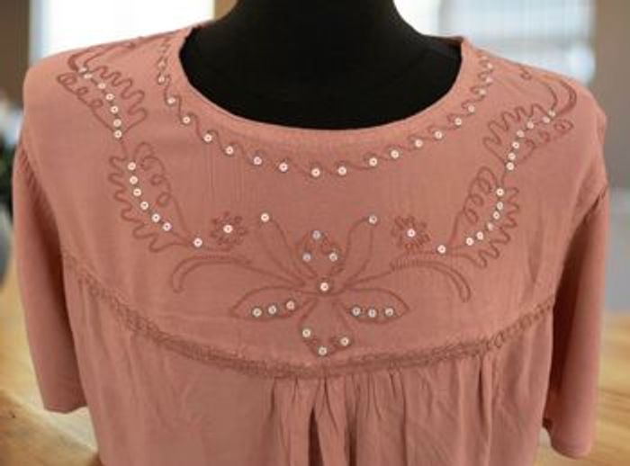 Une robe très confortable, manches courtes, avec broderies et p’tits sequins au buste, neuf , aisselles à aisselles 66 cm, elle taille grand jusqu’à 46. #salsabile1974RobeEthniqueTaille46