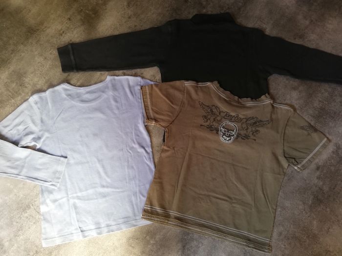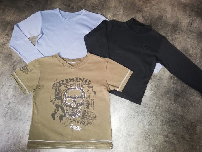 Lot de 3 t-shirts en bon état Ni trou ni tache Le bleu clair est un 10ans sans etiquette, les 2 autres des 8ans Maison sans animaux ni fumeur Pour tout envoi par la poste merci de me contacter avant le paiement #lounaun8ans