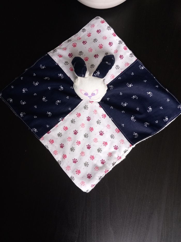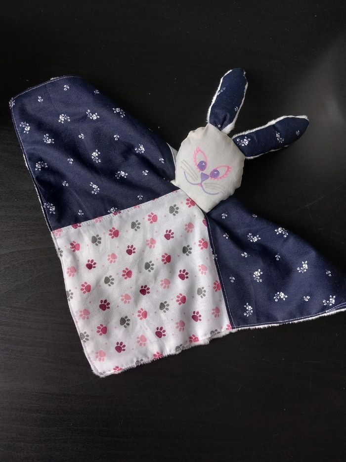 Doudou tête de lapin et doublé tout en tissus coton. Les dessins sont faits avec des feutres spéciales non effacable pour tissus
