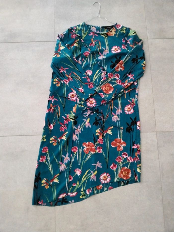 Robe asymétrique atmosphère en très bon état, très peu portée, car changement de taille. Manches longues petit drapé en biais sur le devant pour une petite touche de fantaisie et lien pour nouer à la taille. Maison non-fumeur