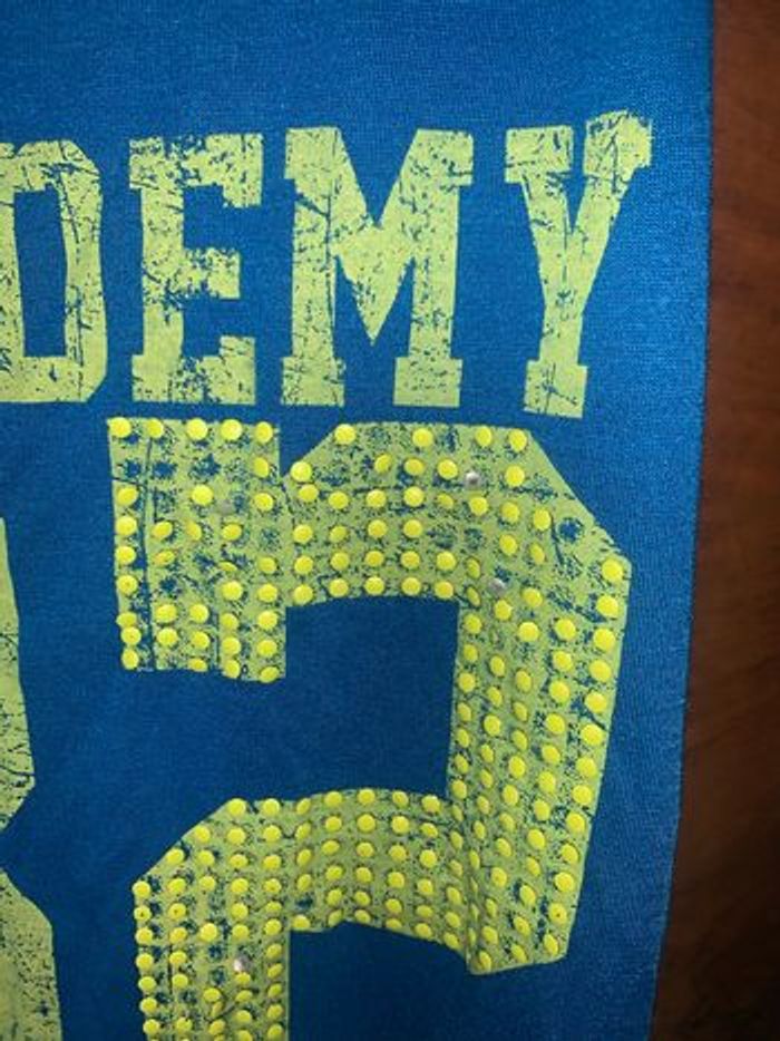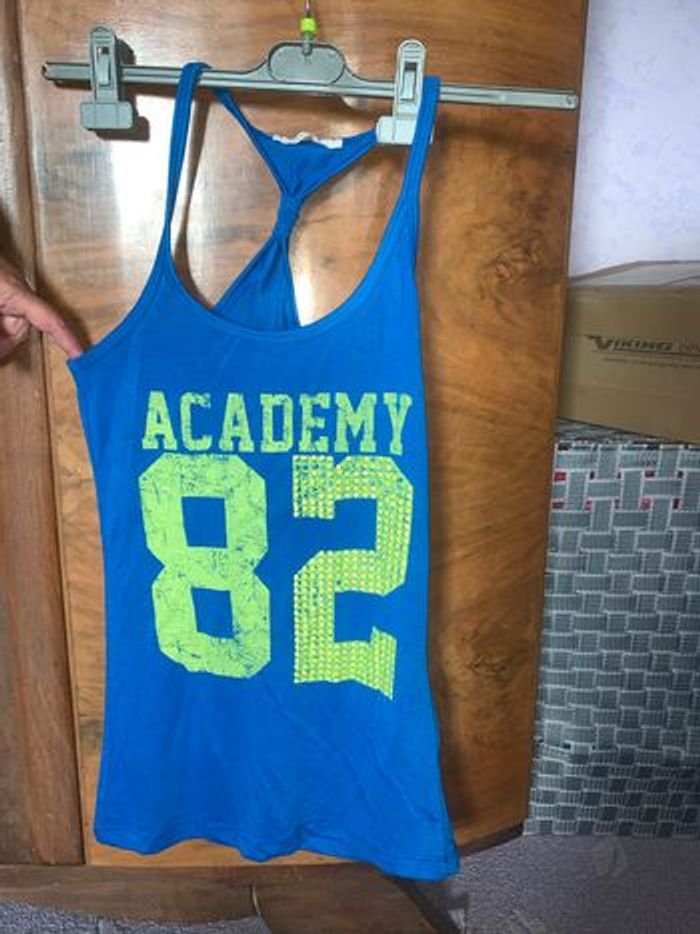 débardeur bleu, 46/48, motif jaune, quelques reliefs qui forment le nombre se décollent légèrement.