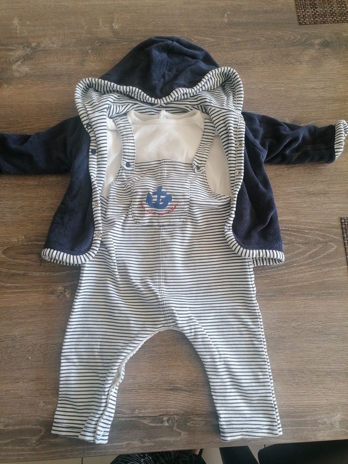 Super ensemble 12 mois absorba, très bon état, composé d'une salopette longue coton, et un gilet double face, bleu marine et rayé, demandee plus de photos si besoin
