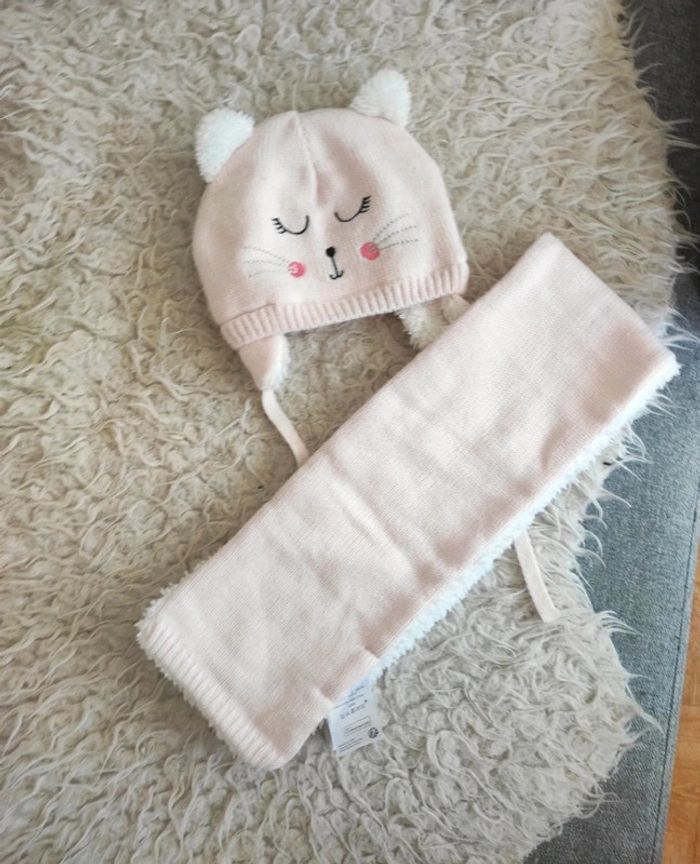 Ensemble bonnet et écharpe neuf Rose pâle Marque pat et ripaton En parfait état Avec doublure polaire Taille 6/12 mois
