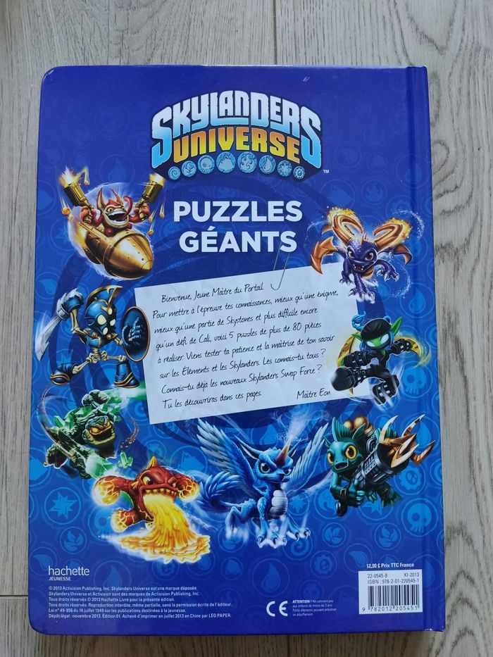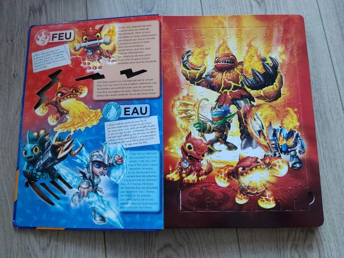 Livre comprend sur chaque page une explication sur les différents pouvoirs des Skylanders + un puzzle les représentant (voir photos 2 et 3). Il y a de tout petits impacts sur la couverture (il faut vraiment les chercher pour les voir) mais le livre est neuf et les puzzles n'ont jamais été touchés.