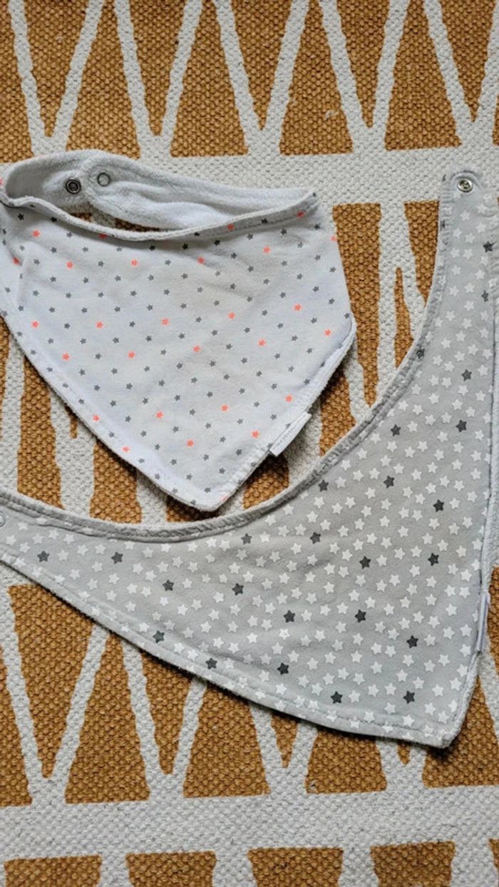 2 bavoirs bandanas. Idéal pour bébé qui fait ses dents. Blanc & gris à étoiles 🌟 mixte. Vertbaudet. #marielubin28_1moisF #marielubin28_6moisF