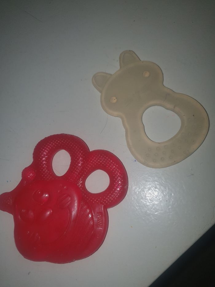 Lot de 2 anneaux de dentition 1 rouge playgro avec de l eau dedans 1 en silicone