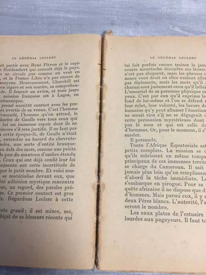 Livre ancien édité aux Editions Plon sur le Général Leclerc. Photos d'époque sur la couverture. Il a bien vécu : reliure détachée, perforation, quelques déchirures (voir photos). Il a toutes ses pages et reste complètement lisible. #lecture #livre #histoire #guerre #2eguerre #2WW