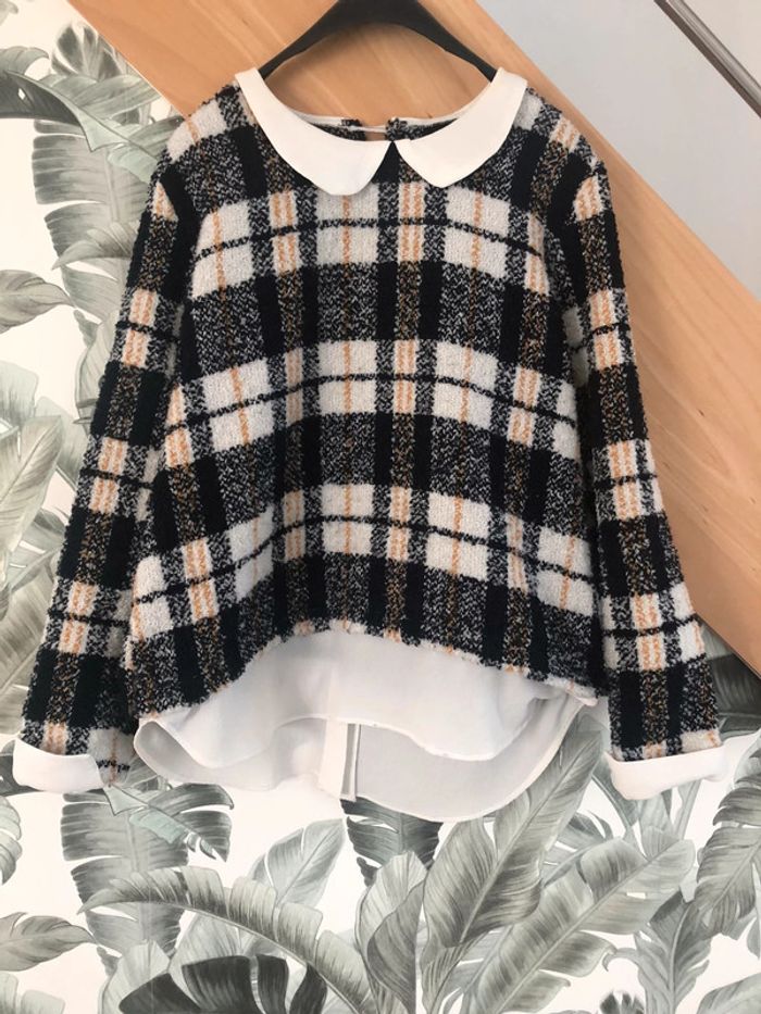 Magnifique haut aspect tweed noir et moutarde à col claudine