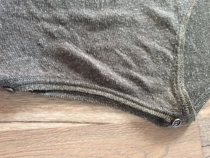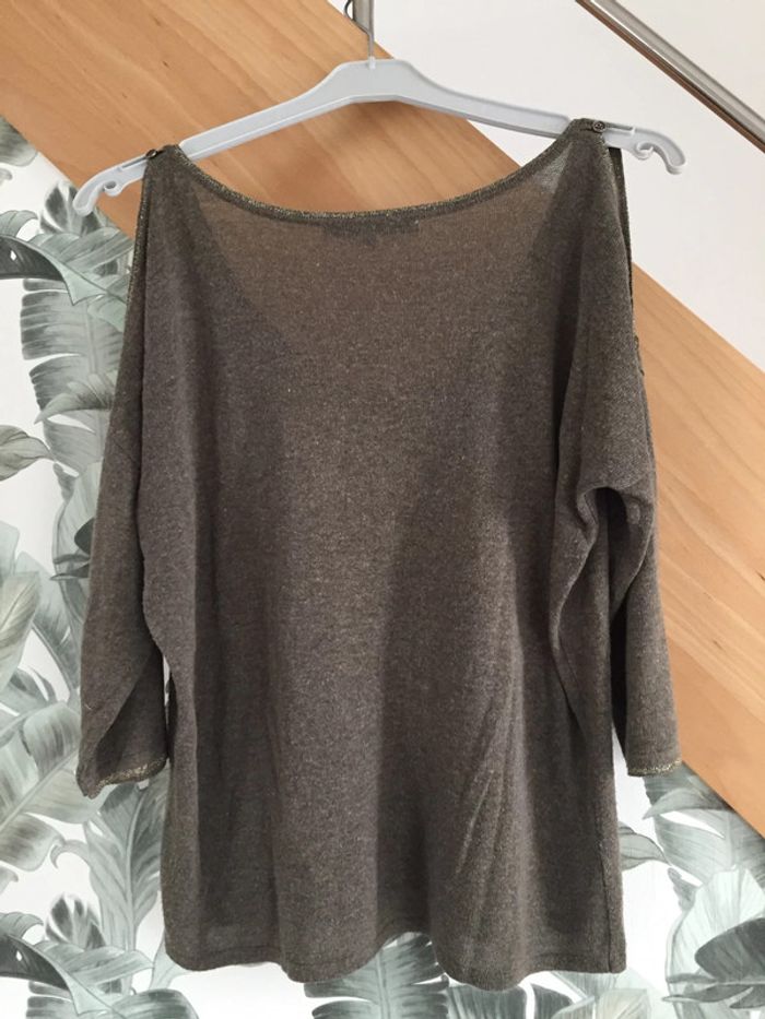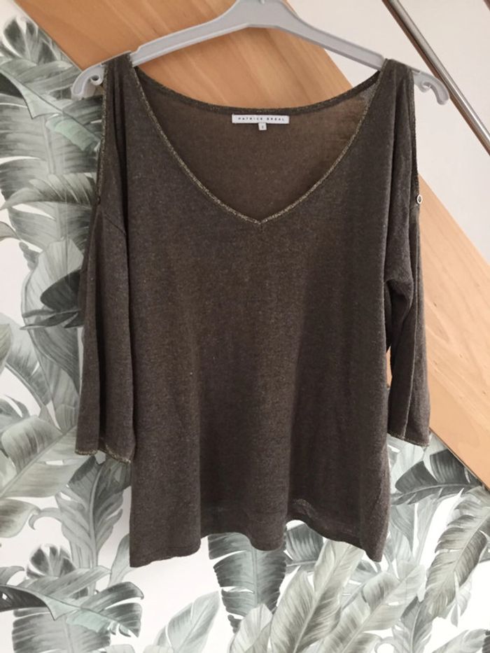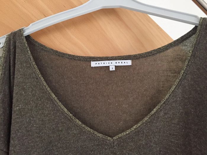 ✨Joli pull léger de couleur kaki avec un liseré doré sur tout le pourtour 🏷 de la marque Patrice Bréal. Encolure en V avec une fente de 15 cm sur Le Bras. ✂️ il est noté en taille 2 mais peut convenir à un 40. Dimensions : - du haut de l’épaule au bas : 60 cm - à plat, d’aisselle à aisselle : 65 cm Il a été porté mais reste propre. #tshirt #haut #femme #pull #patricebreal #kaki