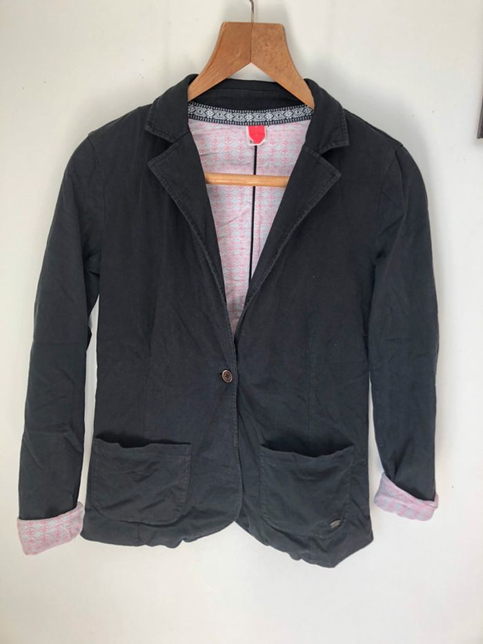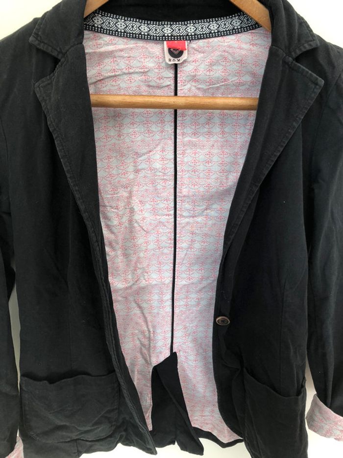 ✨Veste de la marque Roxy en bon état ⚠️couleur passée mais aucun autre défaut ✂️Taille S 🏷100% coton, tissu épais ✨magnifique tissu imprimé rose clair à l’intérieur ✨Made in Portugal #veste #blazer #blazernoir #vestenoire #noir #roxy #vesteroxy #blazerroxy #femme #vestefemme