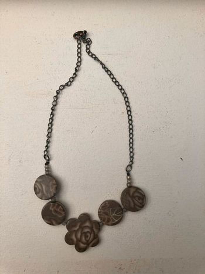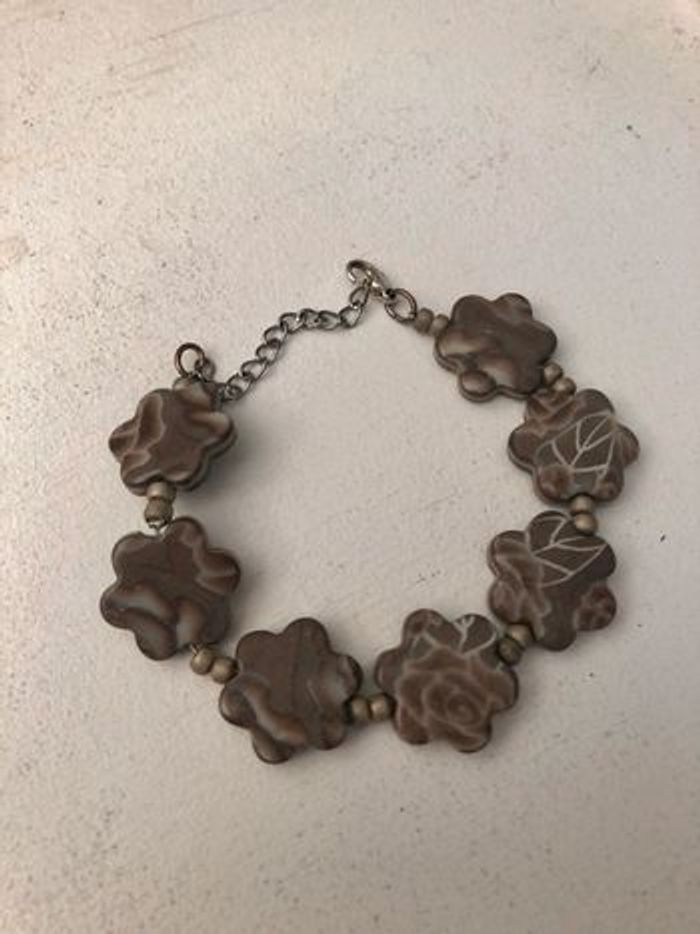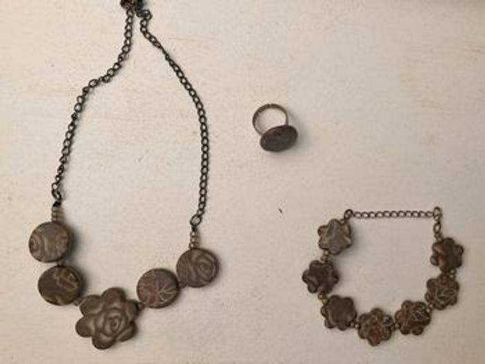 🛍composé : -d’un collier ras du cou de 39cm ajustable -d’un bracelet ajustable de 21cm à -d’une bague réglable d’un diamètre de 2cm à ✨imprimé feuilles et fleurs ✨jolie couleur taupe ✨fait à la main #faitmain #bijoux #bague #bracelet #collier #taupe