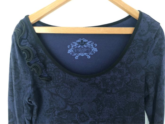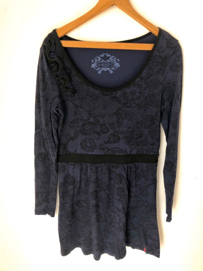 ✨Robe d’hiver bleue marine marque EDC by Esprit - Bon état 🏷50% coton 50% modal ✂️Taille 40 ✨imprimé dentelle noir ✨détail fleur en tissu sur l’épaule gauche #robe #hiver #edc #esprit #bleu #noir